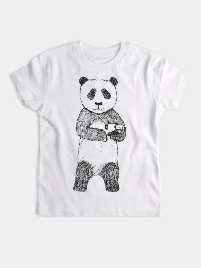 White MOST HUNTED t-shirt for boys with a black panda design, lovingly made by Studio Hart.
