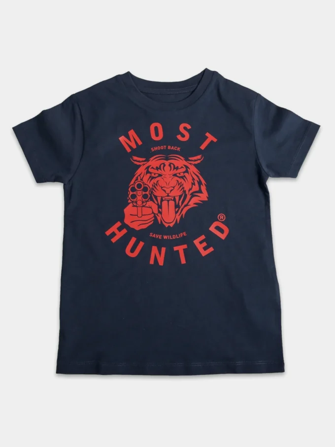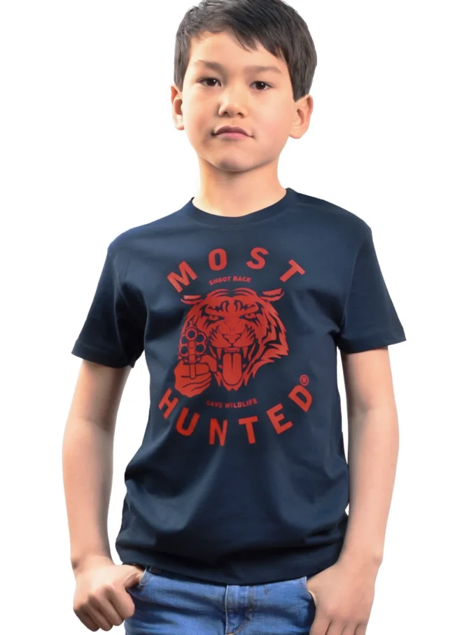 Navy MOST HUNTED t-shirt for boys with a red tiger design.