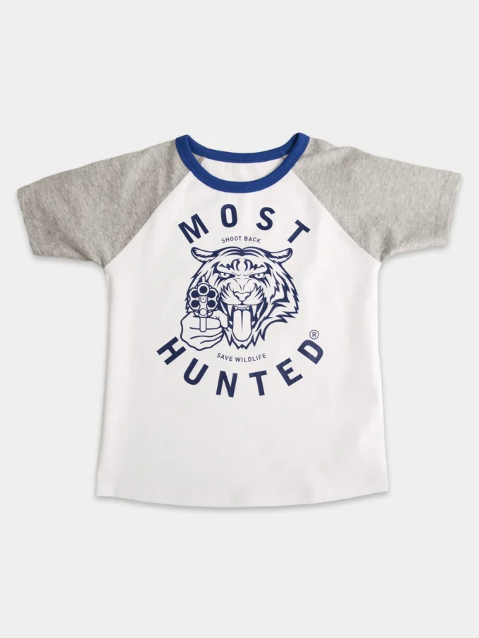 White and gray MOST HUNTED t-shirt for boys with a navy tiger design.