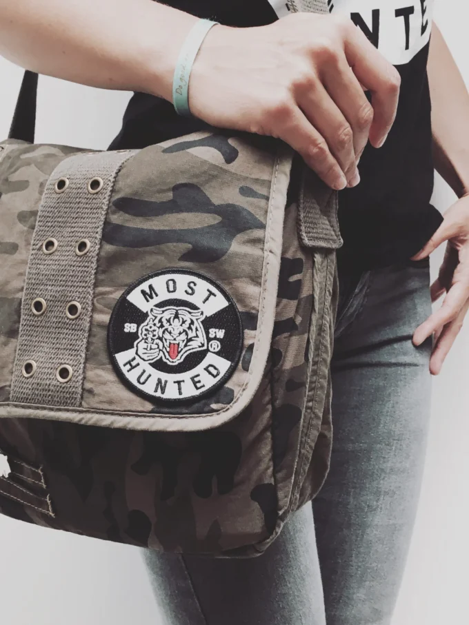 Camouflage shoulder bag with various Most Hunted logos.