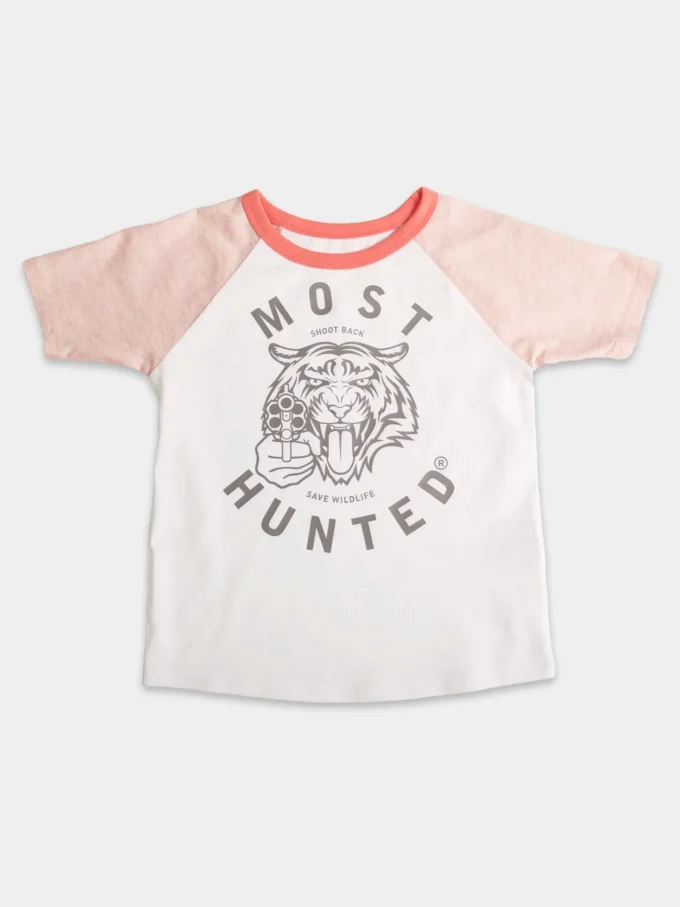 White and pink Most Hunted t-shirt for girls with a gray tiger design.
