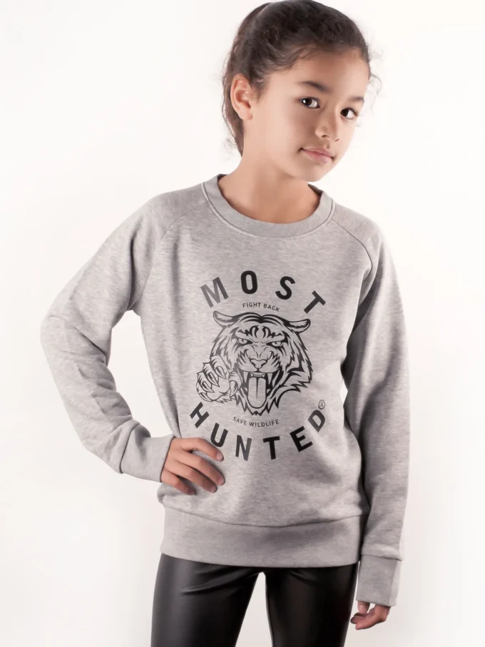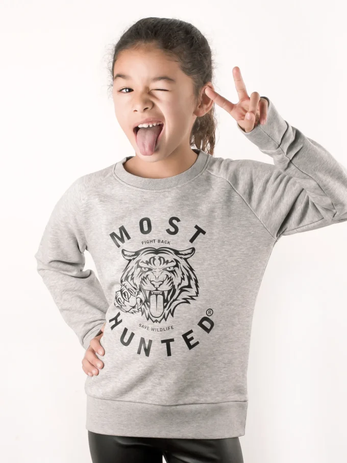 Gray MOST HUNTED sweater for boys and girls with a black tiger claw design.