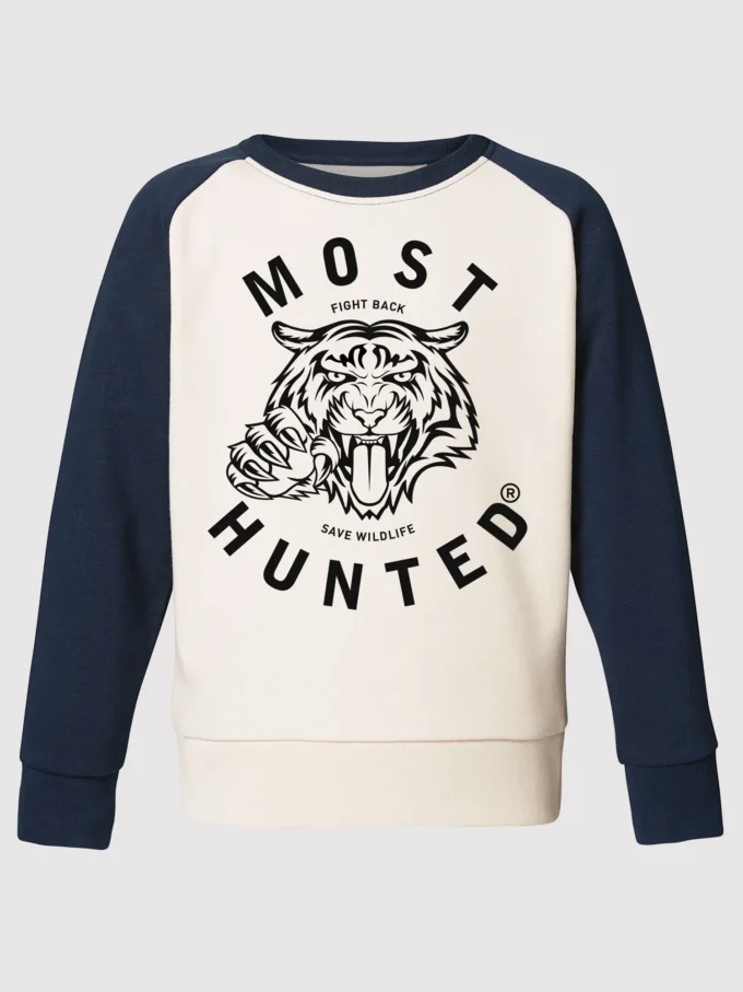 Navy White MOST HUNTED raglan sweater for boys and girls with a black tiger design.