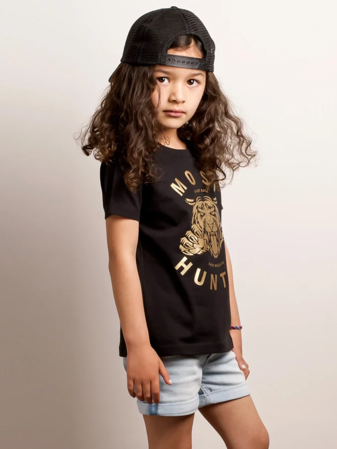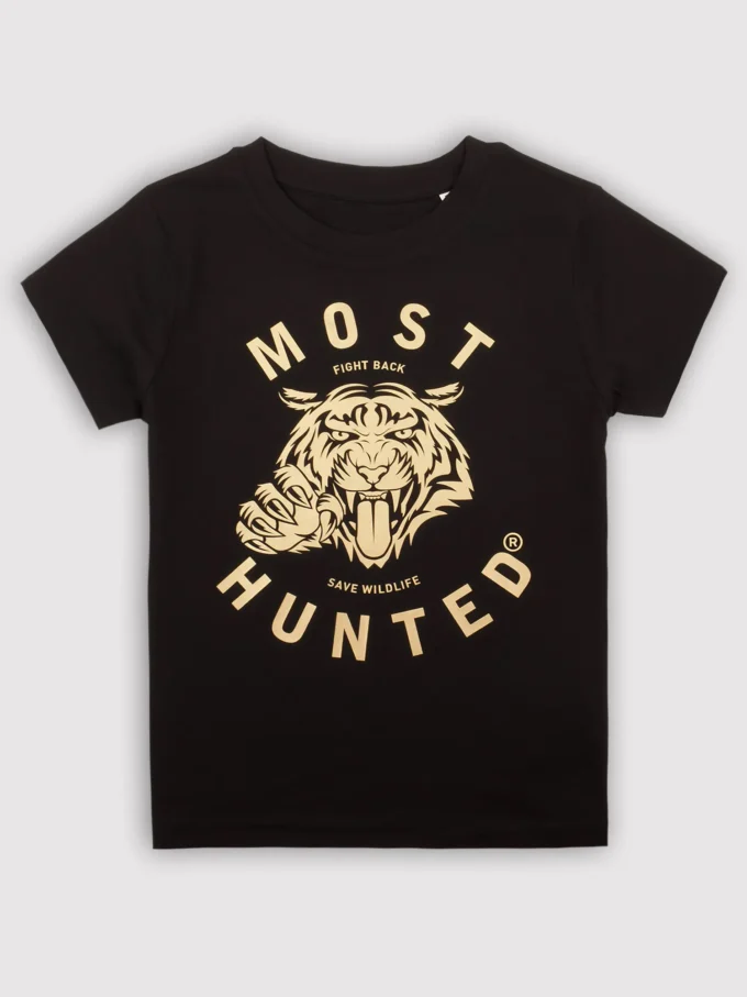 Black MOST HUNTED T-shirt for boys and girls with a gold tiger design.