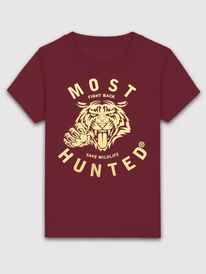 Bordeaux MOST HUNTED T-shirt for boys and girls with a gold tiger design.