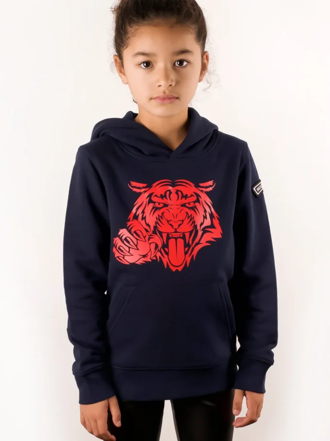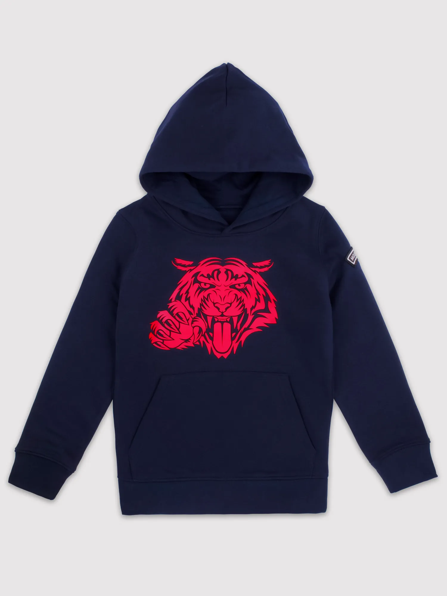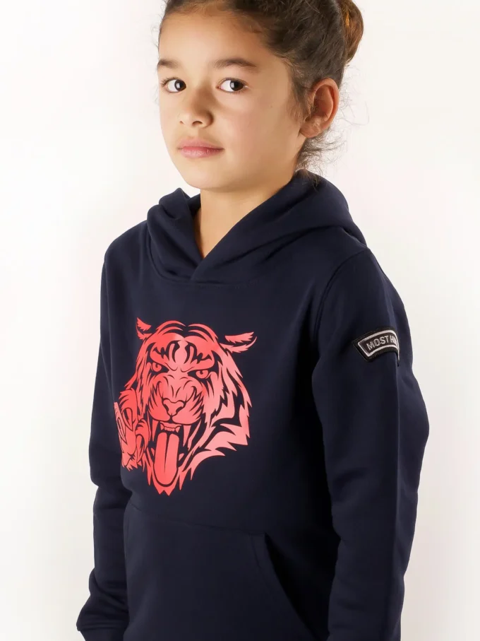 Navy MOST HUNTED hoodie for boys and girls with a red tiger design.