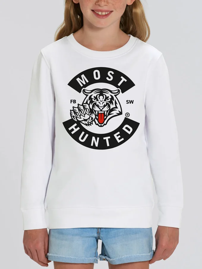 White MOST HUNTED sweater for boys and girls with a black tiger design.