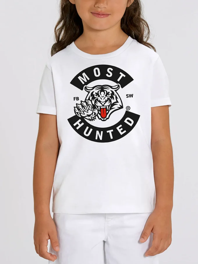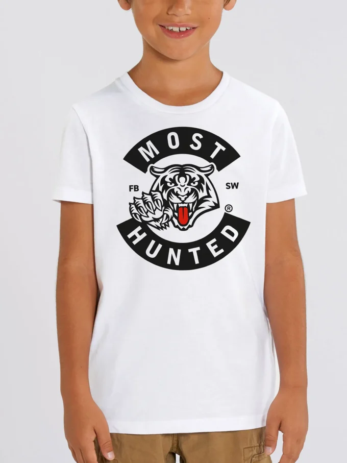 White MOST HUNTED T-shirt for boys and girls with a black tiger design.