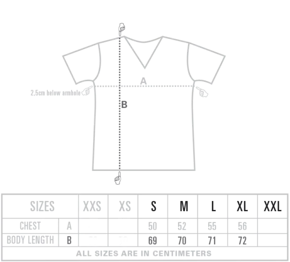 Measure a garment that fits you well and compare the dimensions with the size chart below.