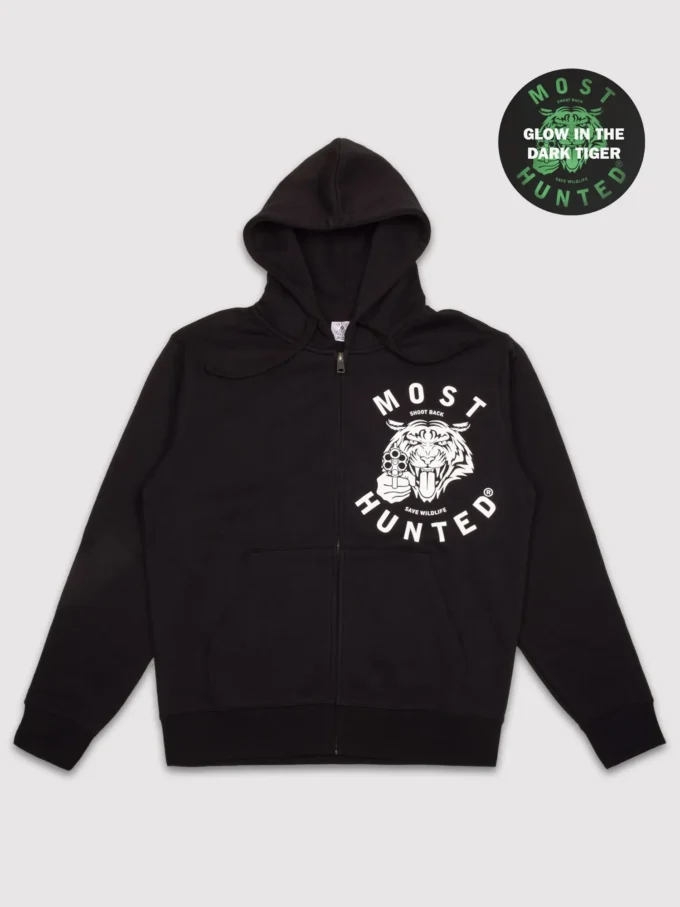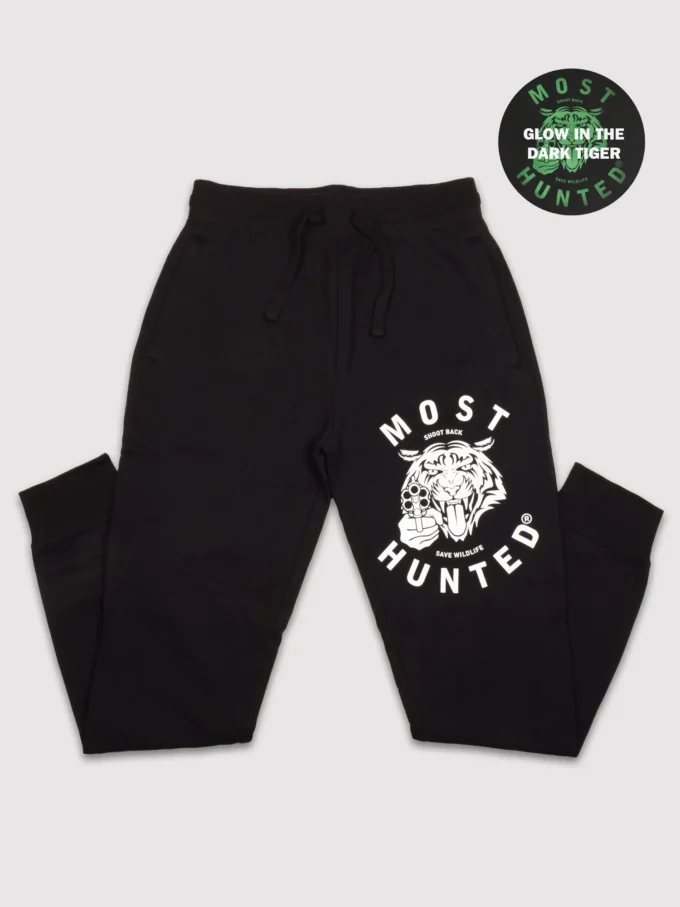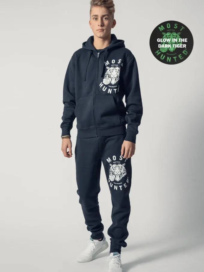 Black tracksuit jacket with hood, zipper, and white Most Hunted tiger glow design on the left chest. Black tracksuit pants with the same white tiger glow design on the left upper leg.