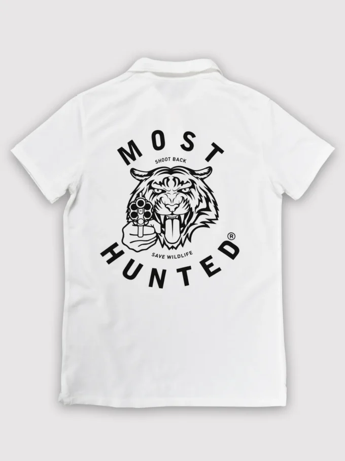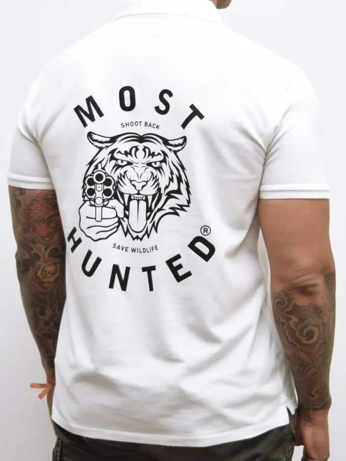 White vintage polo shirt with a MOST HUNTED tiger embroidery on the left chest and a black MOST HUNTED tiger print on the back.