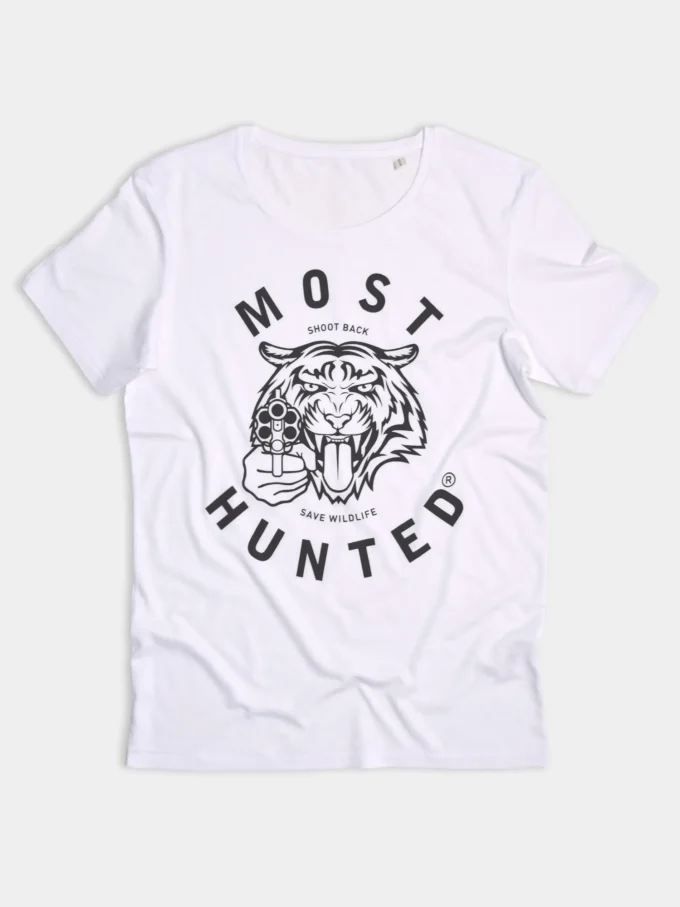 White Most Hunted men’s t-shirt with black tiger design.