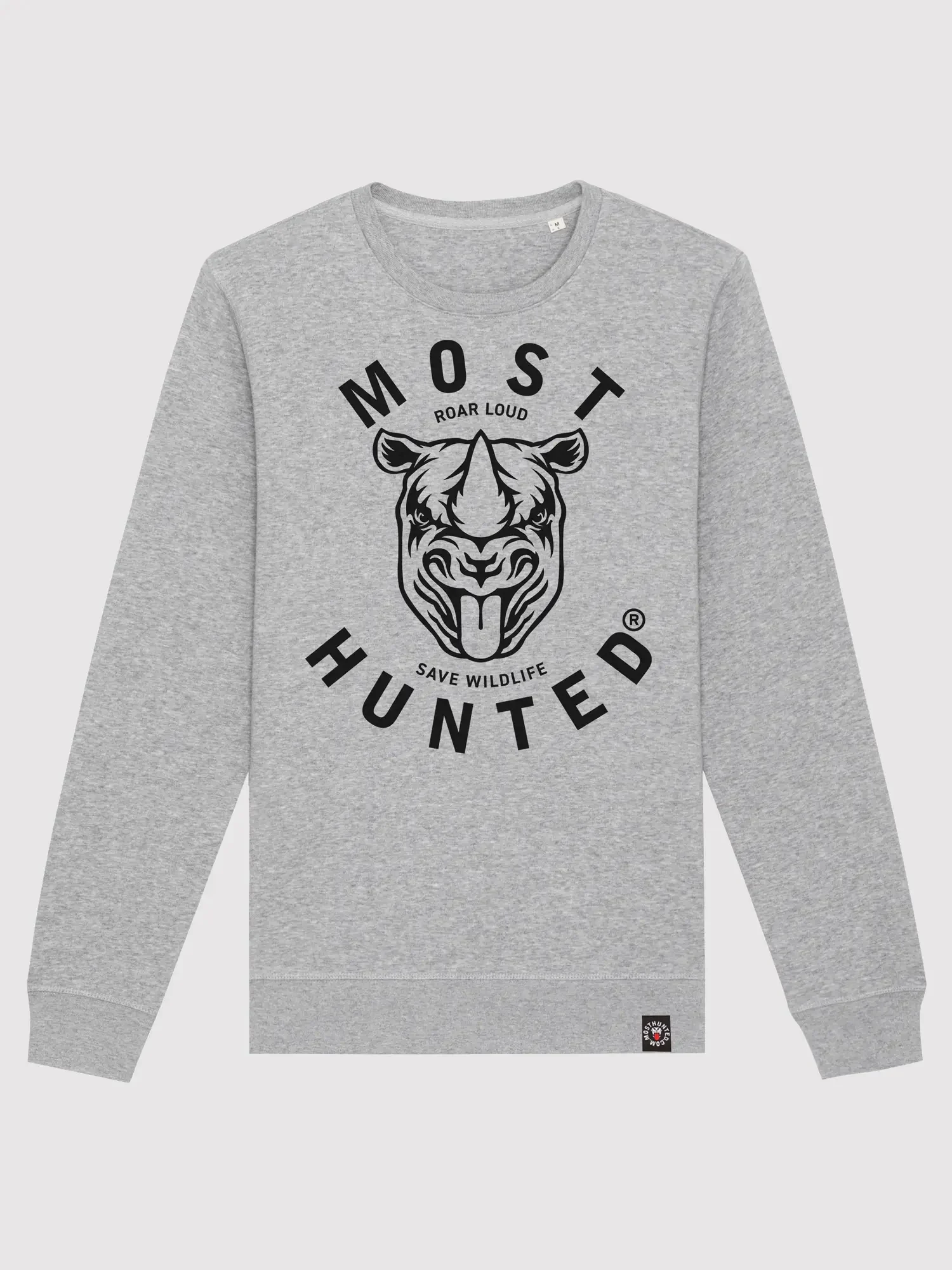 Grey unisex sweater with Most Hunted rhino design on the front.