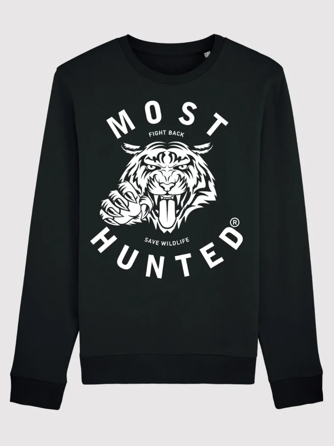 Black unisex sweater with Most Hunted white tiger claw design.