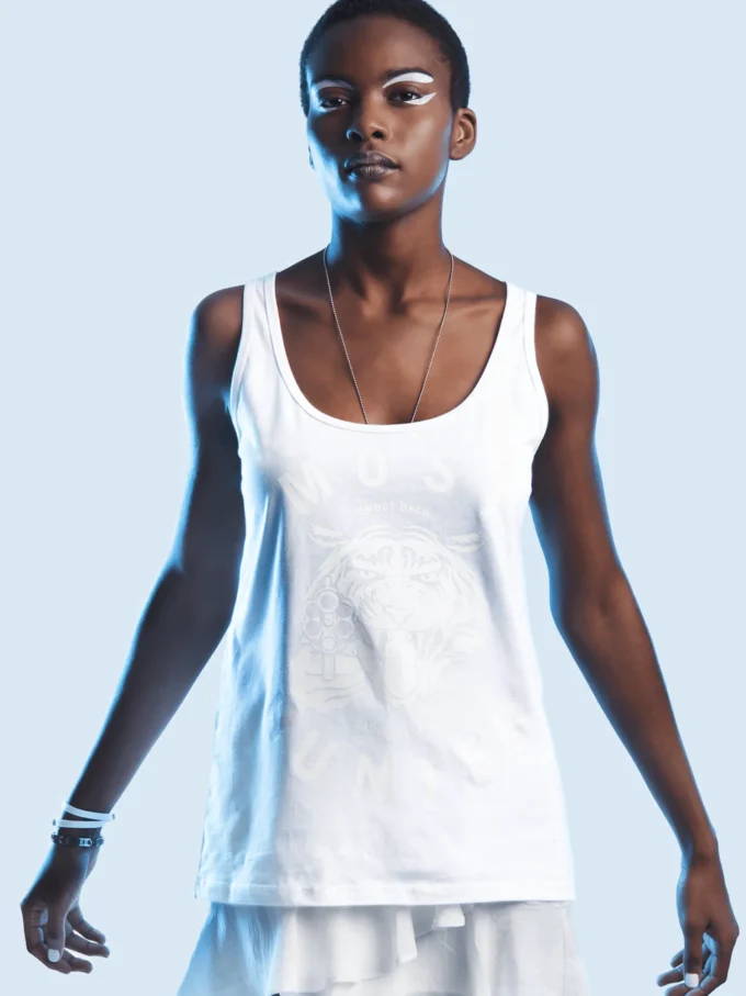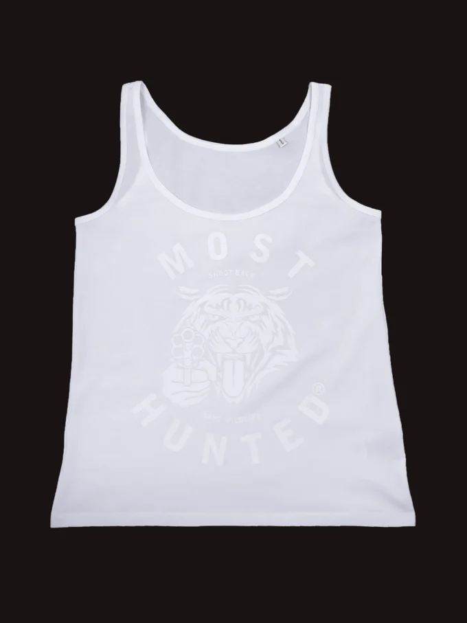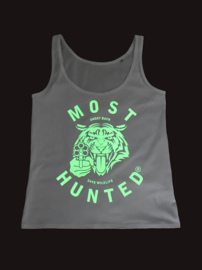 White Most Hunted tank top with glow-in-the-dark tiger design.