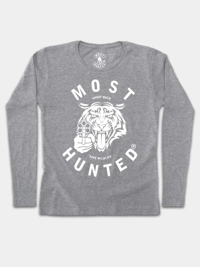 Grey basic longsleeve t-shirt with white MOST HUNTED tiger design. Limited edition.
