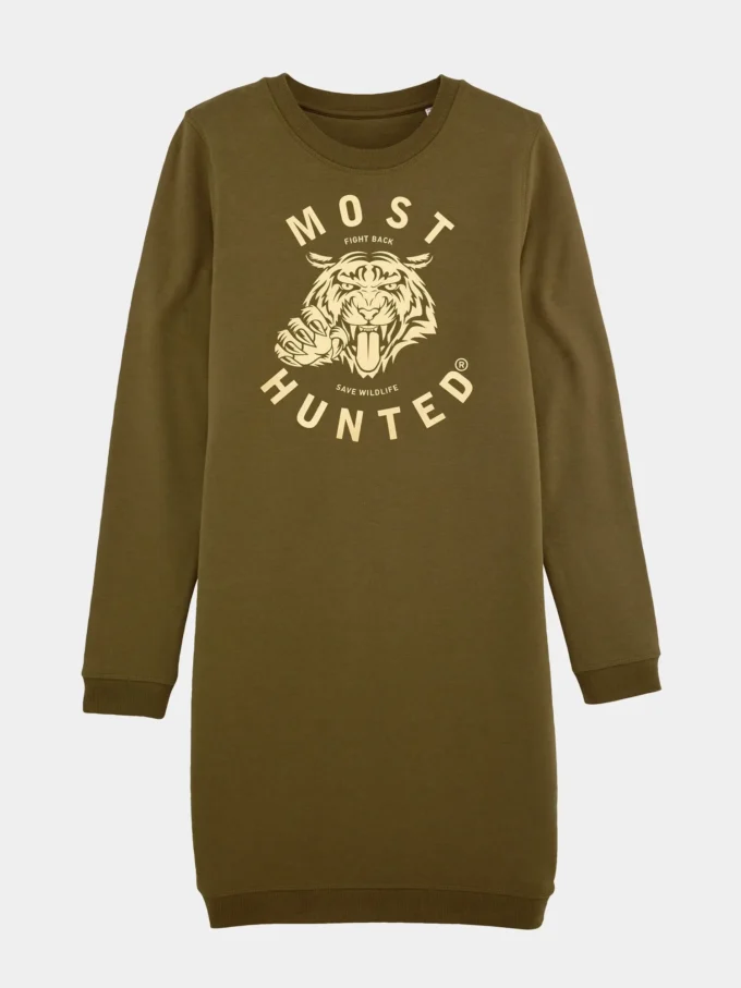 Army green sweatdress with gold Most Hunted tiger claw design.