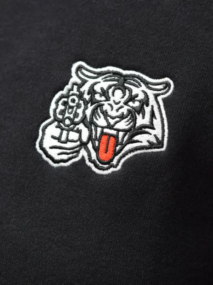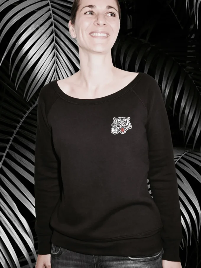 Comfortable black sweater with a feminine wide neckline, raglan sleeves, and a MOST HUNTED tiger embroidery on the chest.Limited edition.