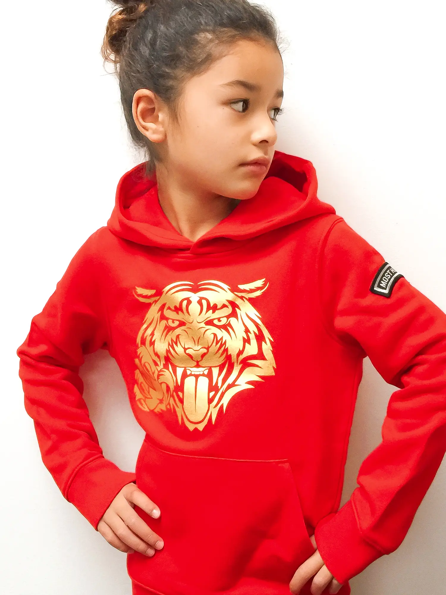 Rood MOST HUNTED hoodie voor jongens en meisjes met goud tijgerdesign.