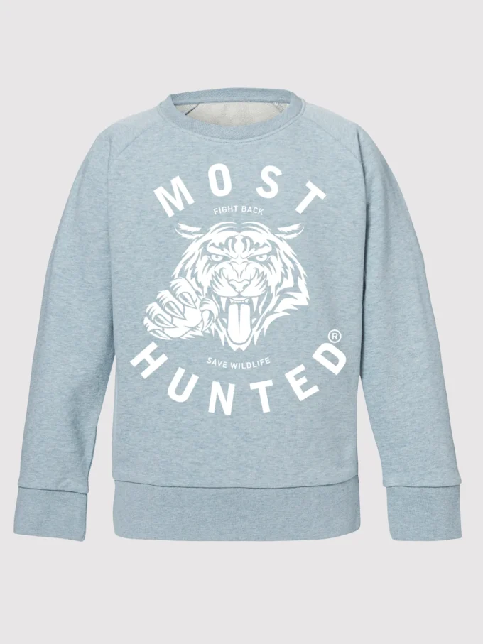 IJs blauw MOST HUNTED raglan sweater voor jongens en meisjes met wit tijger design.