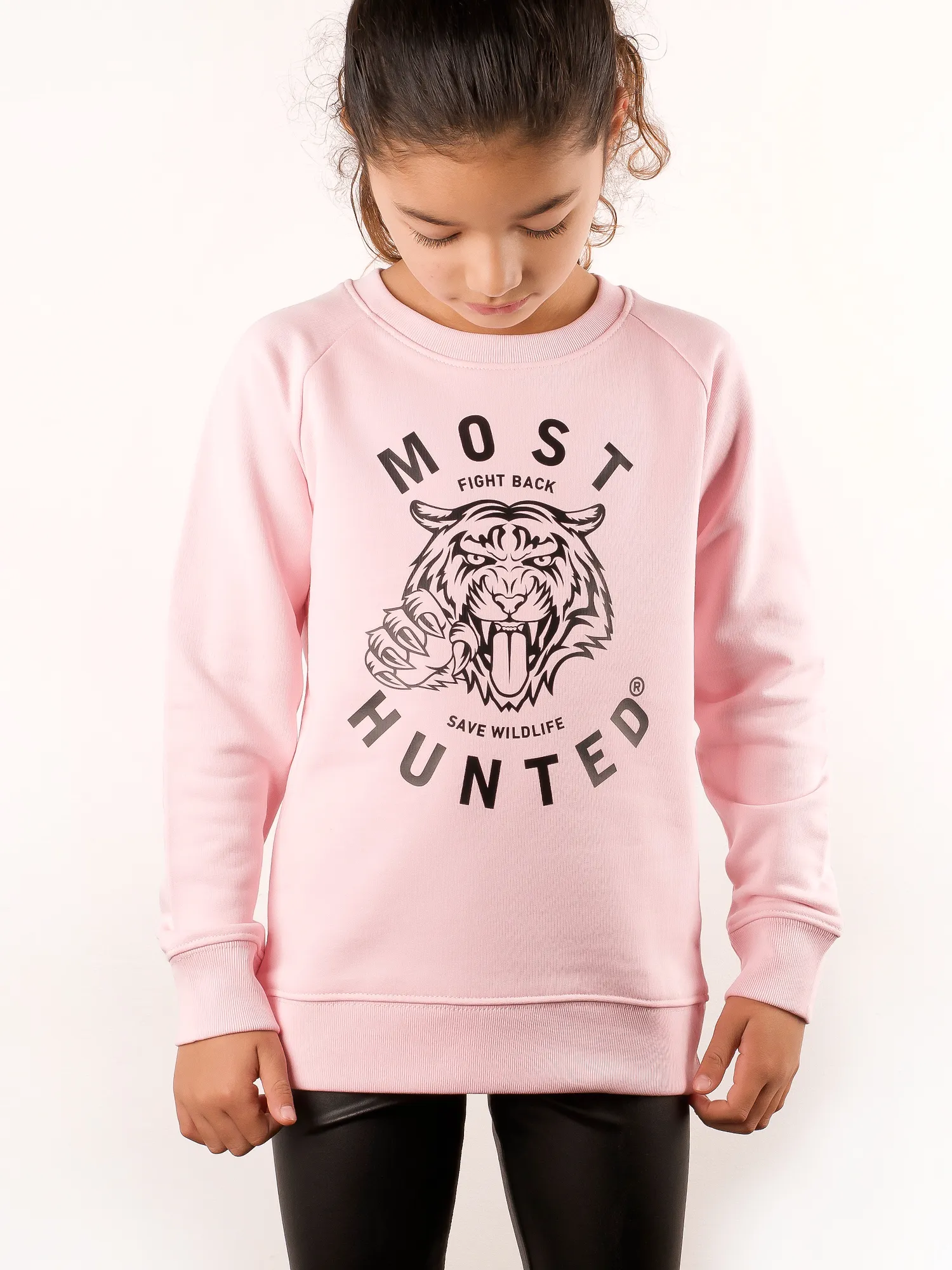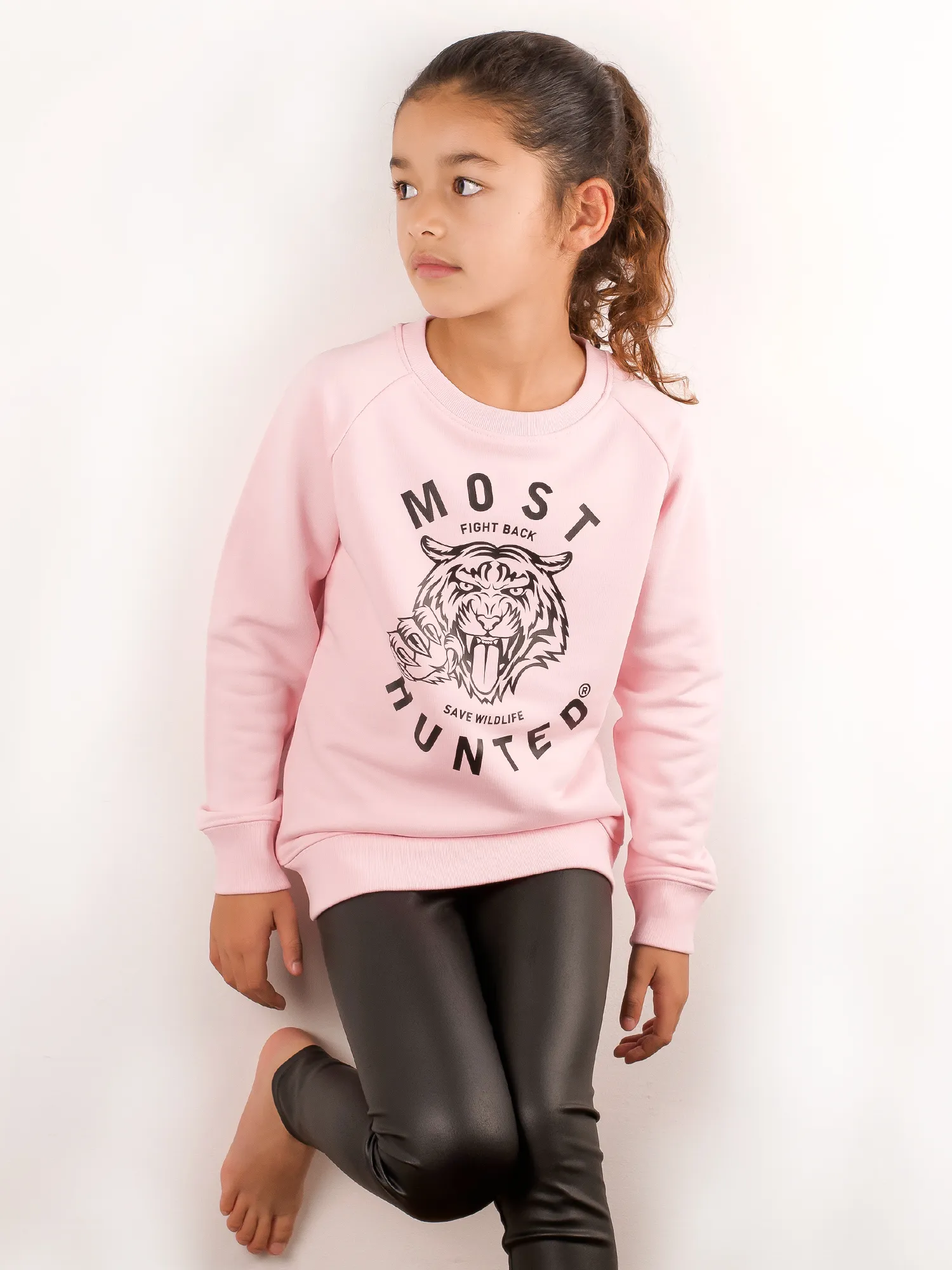 Roze MOST HUNTED raglan sweater voor jongens en meisjes met zwart tijger design.