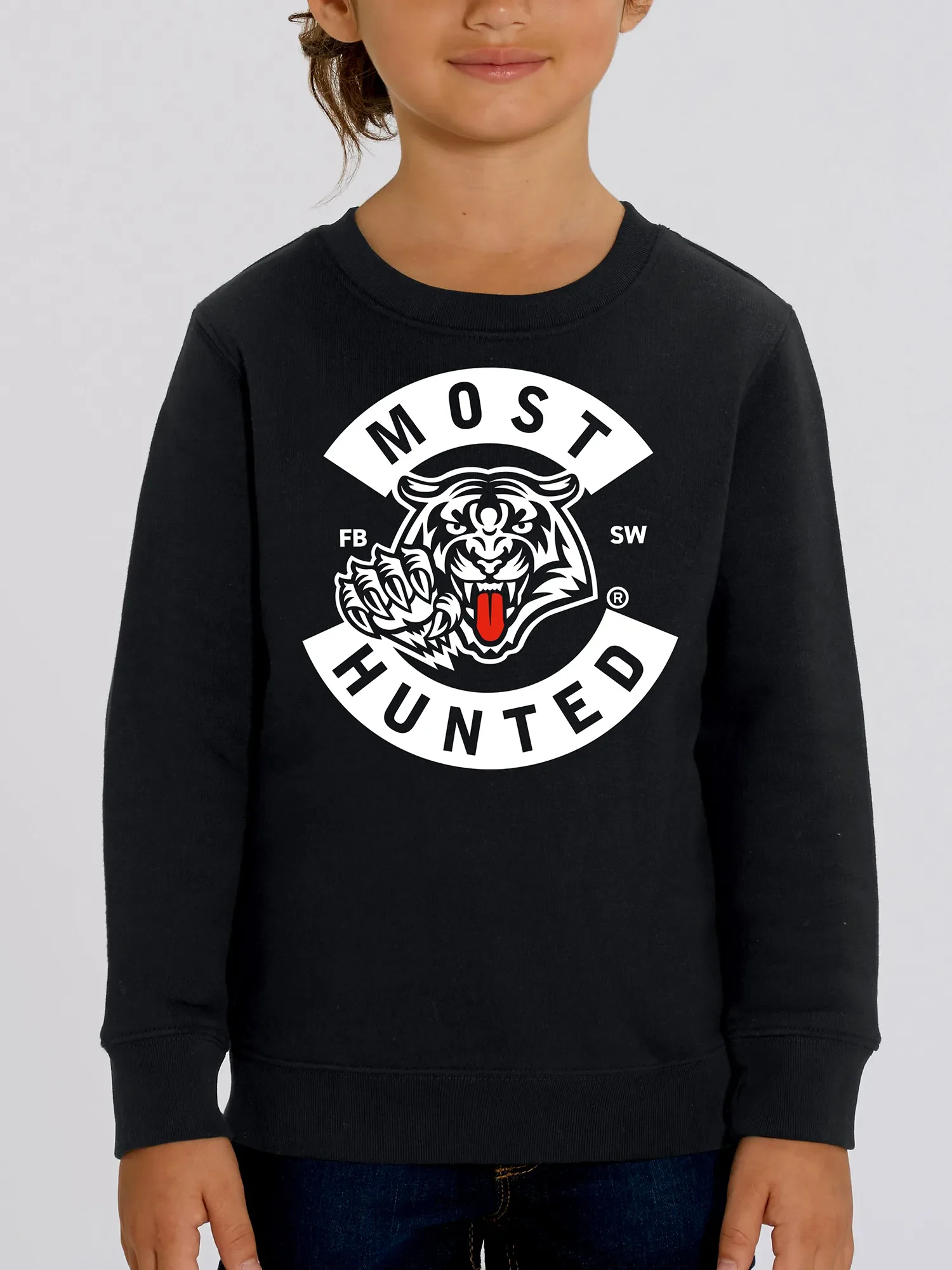 Zwart MOST HUNTED sweater voor jongens en meisjes met wit tijger design.