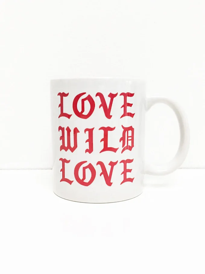Basic witte mok van keramiek met rood Most Hunted Love Wild Love print.