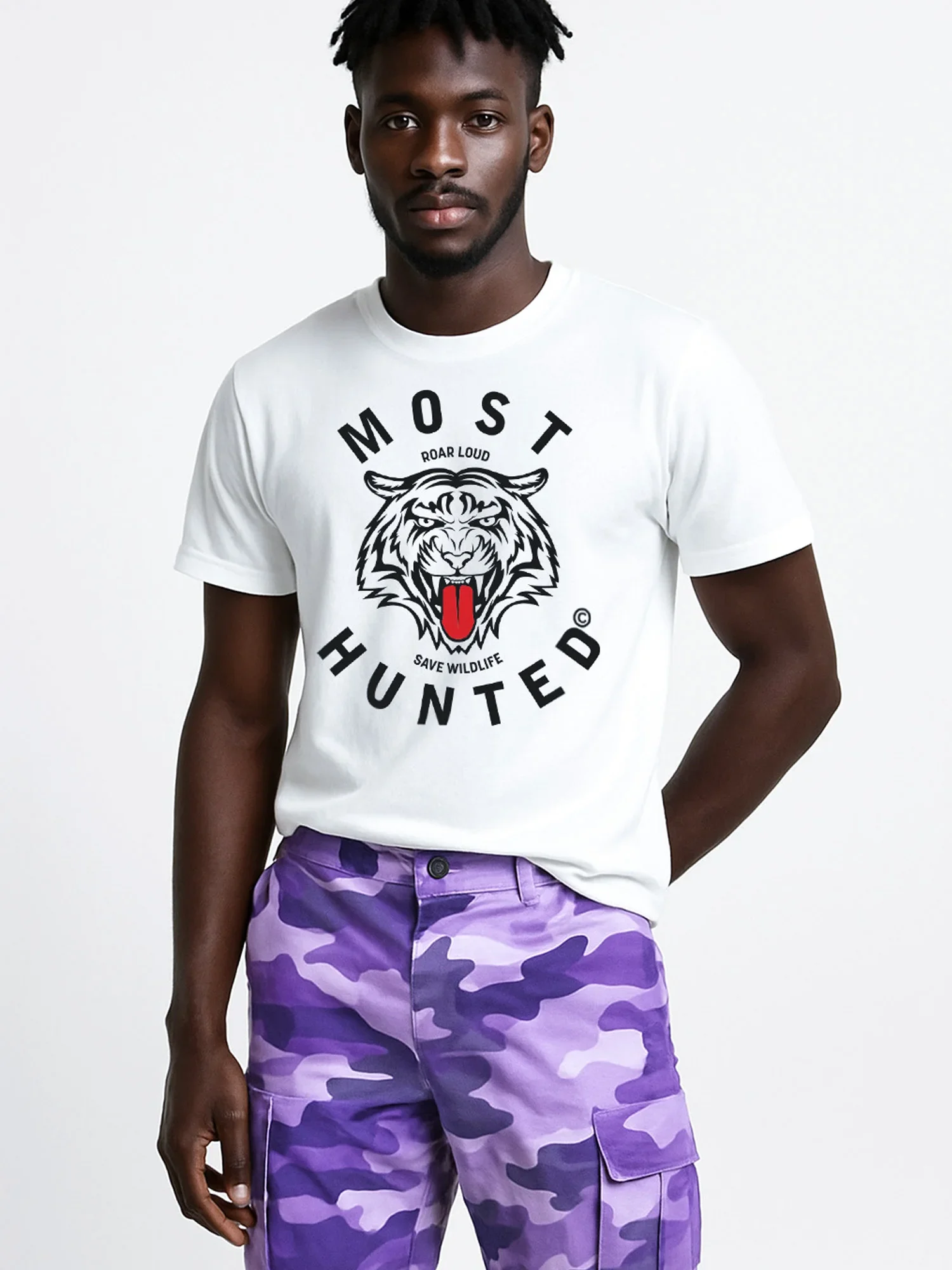 Wit MOST HUNTED t-shirt voor dames en heren met zwart rode tijger design.