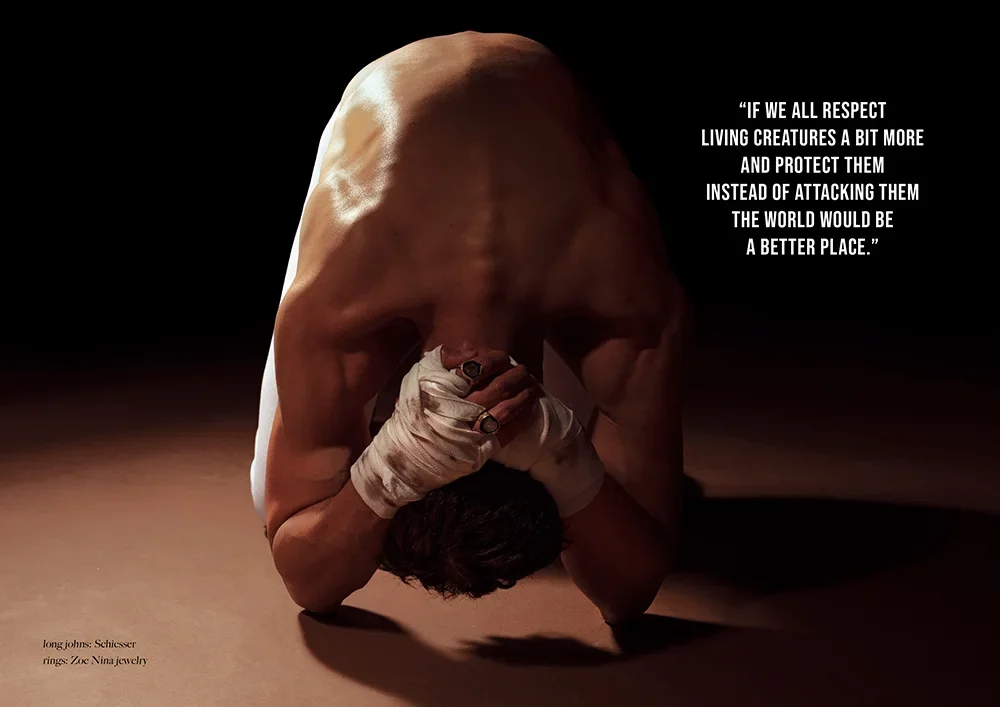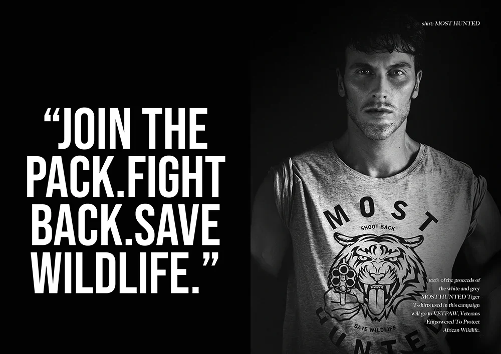 Het hele idee heb ik op persoonlijke titel uitgewerkt, omdat ik mijn visie op de wildlife situatie als model en fotograaf wilde delen. Toen ik bezig was met het maken van het verhaal en de beelden, besloot MOST HUNTED om 100% van de opbrengst van de witte en grijze T-shirts die gebruikt zijn in mijn campagne te doneren voor het beschermen van wilde diersoorten (deze actie is inmiddels verlopen). Ik vind wat MOST HUNTED probeert te doen en te bereiken heel inspirerend. Op mijn beurt probeer ik nu andere mensen te bereiken en inspireren. Zelfs als het maar één persoon is die ik kan raken, zou ik al blij zijn. Maar hoe meer hoe beter natuurlijk.